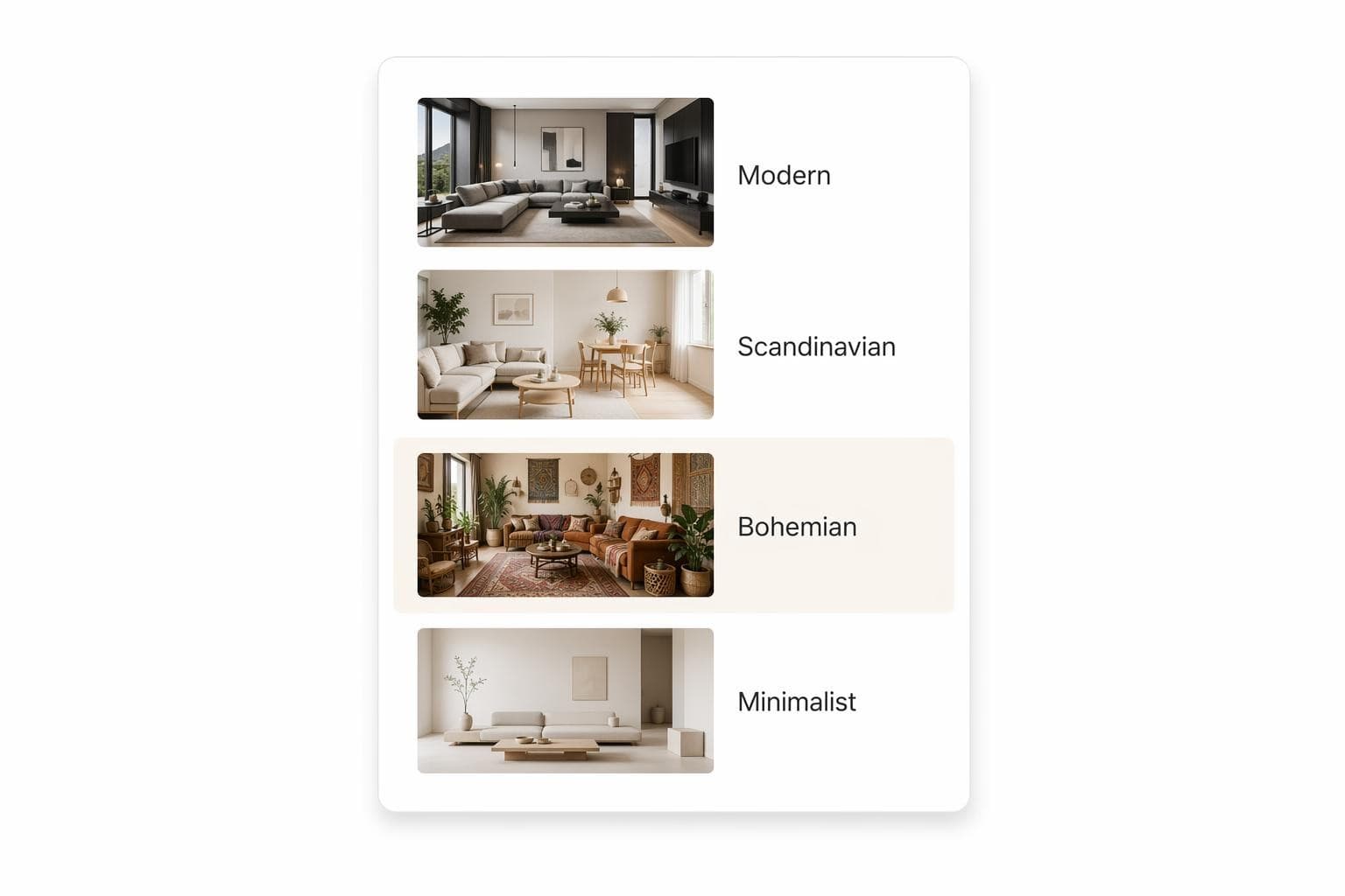 Select from dozens of interior design styles — modern, minimalist, industrial, Scandinavian, and many more. Pick the room type for best results.